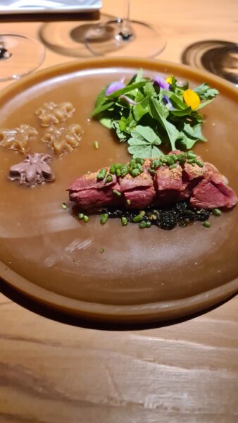 Il piccione in deu servizi: viene fatto maturare per due mesi nella cera d’api, perde, al sapore, la parte ematica e permette una cottura insolita per il piccione, assolutamente non violenta. La consistenza è diversa, il sapore è diverso. Davvero interessante l’intero processo che porta al piatto. Il piatto che contiene il piccione è in cera d’api e tutte le sere viene fuso e poi ricostruito. Un gran lavoro, in tutti i sensi.