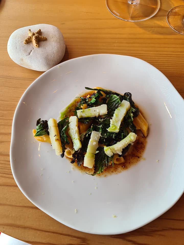 Divertente la pasta, da mangiare con le pinzette, ricorda le grigliate, simbolo della Riviera Adriatica. Le sensazioni amaricanti sono la svolta nel piatto che fanno da contrasto, sempre in maniera tenue, del caldo abbraccio della pasta.