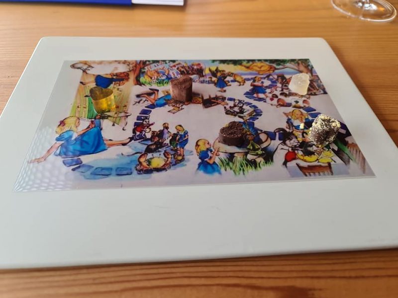 La cernia è estremamente elegante, soda nella carni, centro del piatto con tante piacevoli sfumature che ruotano intorno. Frollatura dei pesci, ma anche della carne, come in questo caso del piccione che riposa nel Tunnel avvolto da una muffa. Anche in questo caso il risultato è straordinario. Se nell’abbinamento con melanzane e salsa di funghi fermentati si apprezza la completezza del piatto, con il piccolo assaggio del filetto con un pezzetto di acciuga del Cantabrico si può apprezzare tutta l’intensità e la concentrazione di sapore della carne.