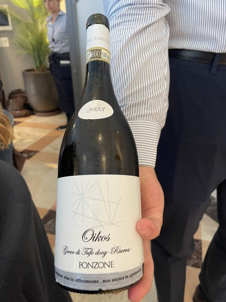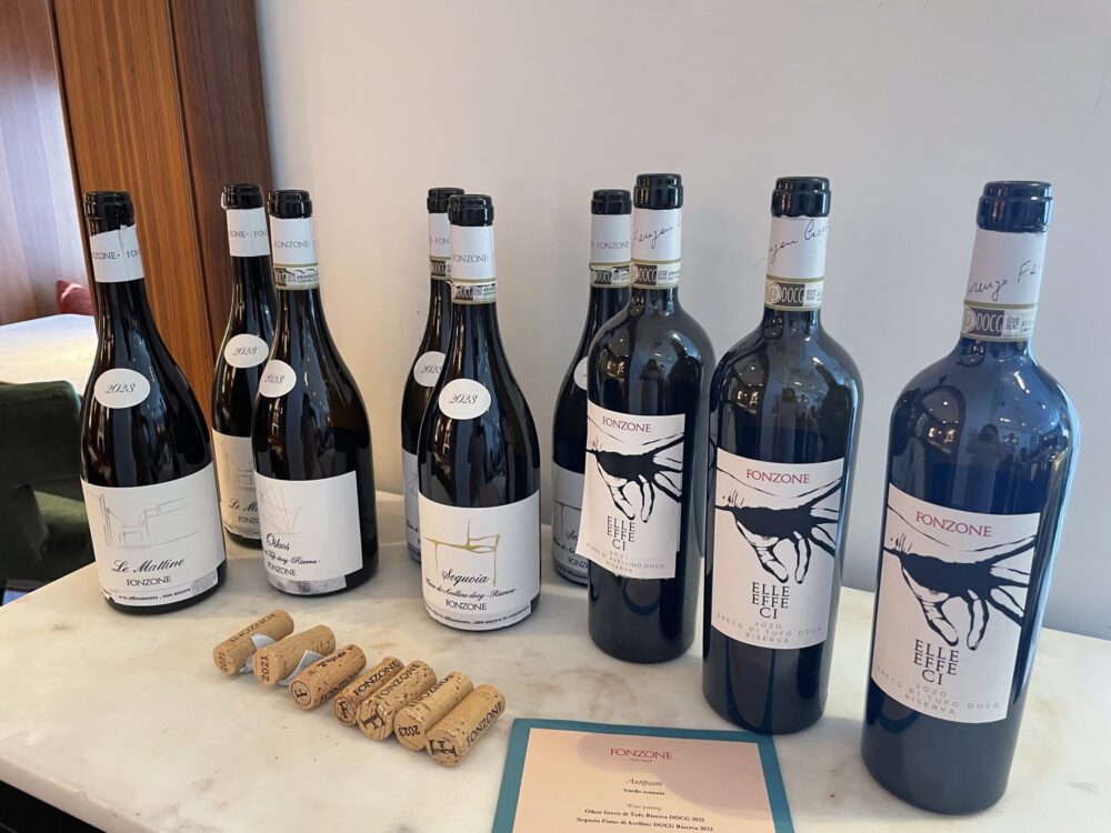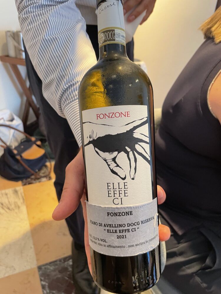 Il futuro ELLE EFFE CI potrebbe essere un Taurasi questo ancora non si sa, di sicuro verrà fatto solo con la migliore uva dell’annata. Spirito di sperimentazione e nessuna paura nel confrontarsi con altri produttori anche storici di questa parte d’Irpinia hanno permesso a questa azienda di trovare un proprio stile espressivo, facendo pratica con vari strumenti di affinamento tra cemento, acciaio, botti di rovere austriaco e anfore in cocciopesto, certi di poter contribuire con il proprio lavoro e il proprio spirito a dare valore ad un territorio di grandi vini. Dal 2019 coadiuvati dall’enologo Luca D’Attoma hanno preso maggiore coscienza delle proprie capacità ed è in questo momento che nasce questo vino del cuore, dedicato al fondatore. Altro Fiano assaggiato in anteprima è il Sequoia 2023 DOCG Riserva, pulito essenziale, nitido nei profumi e dal sorso verticale e acidulo. Qui interviene la botte grande di rovere austriaco per 12 mesi e barili di rovere francese più 6 mesi di acciaio e ancora 6 mesi di bottiglia. E’ un vino che va conosciuto nel tempo, che ha bisogno di tempo e che già in questo sorso in anteprima esprime la sua qualità intrinseca. I vini di Fonzone sono presenti nell’alta ristorazione e il 45% della produzione è rivolto all’export soprattutto Europa e Giappone.