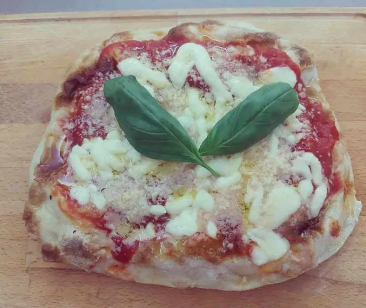 Sfornarla, tagliarla in 6 spicchi, aggiungere del basilico fresco e un giro d’olio (circa 5 gr).