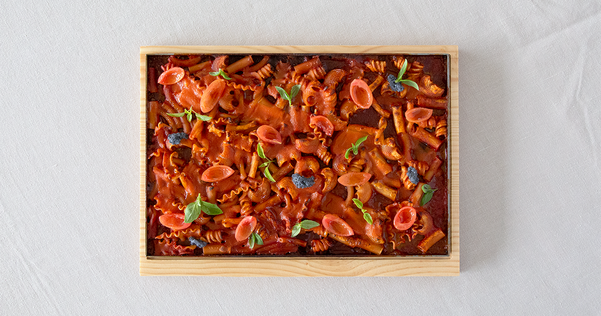 Questa preparazione rende omaggio al pomodoro e ne esalta tutte le caratteristiche. L’idea del piatto nasce con l’intento di voler replicare le sensazioni e i ricordi legati alla vita di campagna e al periodo di raccolta dei pomodori della terra di proprietà. Per l’occasione era tradizione riunire la famiglia e preparare una semplicissima pasta al pomodoro, in grande quantità, con pomodori appena raccolti e un misto di pasta, tra quella che si trovava in credenza. La pasta rimanente riposava in frigo, assorbendo tutti gli umori del pomodoro e, una volta in padella, spiccava per croccantezza, doratura e profumo.