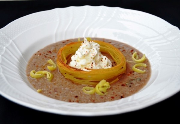 Per l’impiattamento: disporre la minestra in una fondina, posizionare l’anello di pasta nel centro, riempirlo con la mousse di mozzarella di bufala e panna, finire con una spolverata di peperoncino non troppo piccante e una grattugiata di olio solido.