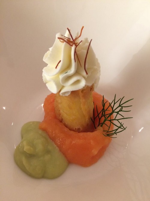 Esordio con Cannolo croccante e ricotta di mucca su gelatina di Gazpacho, sapore freschissimo che ravviva un palato anestetizzato dall’Inverno.
