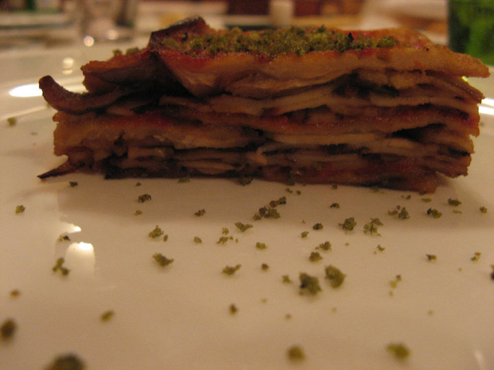 In una placca stendere un piano di melanzane, condire con la salsa di pomodoro, affettare il polpo con l’affettatrice e stendere un piano, alternare le melanzane ed il polpo.