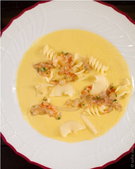 A seguire un amarcord: il piatto simbolo – la passatina di ceci e gamberi – del Gambero Rosso che vien trasformata in pasta-tina di ceci con gamberi.