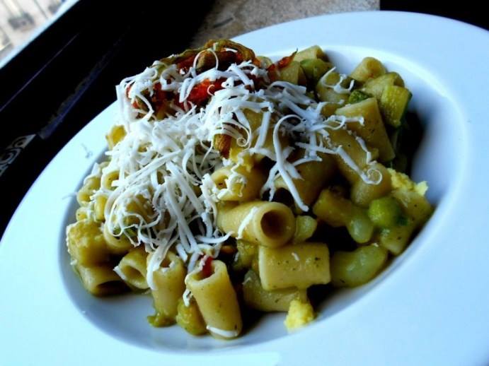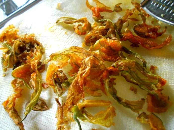 Mantecare il tutto unendo zucchine fritte e i fiori di zucca.