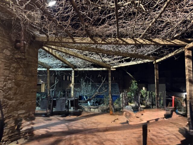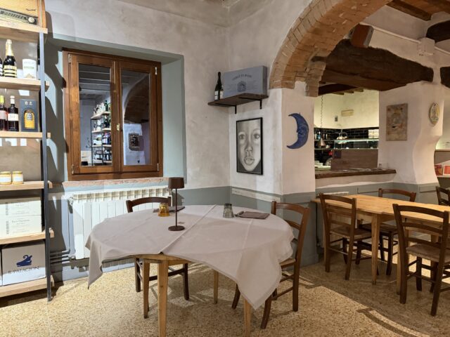 La Pergola di Radicondoli, della famiglia Vatti, conserva la stratificazione dei locali di una volta: bar, ristorante, pizzeria, ed è nel centro storico. Ad affiancare Tommaso c’è la moglie Silvia, che si occupa della sala e dei vini.  Il bar all’ingresso, tipico dei locali un tempo polifunzionali, contribuisce all’atmosfera autentica e al clima conviviale. Il forno, invece, è posizionato lungo il perimetro che conduce all’ampio pergolato di uva fragola, dove lo spettacolo del panorama è ben visibile. Non a caso, i tavoli in terrazza sono molto ambiti nelle serate estive e prenotati con mesi di anticipo.