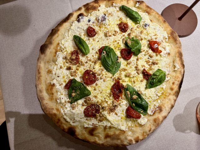 Il disco, leggero, unisce fragranza e morbidezza; il cornicione è basso e appena accennato, mentre i topping diventano vere e proprie cartine geografiche gastronomiche della Toscana. Dalla mozzarella alla stracciatella, fino ai salumi simbolo del territorio, come finocchiona, pancetta e prosciutto di Cinta Senese; poi i formaggi, come il pecorino toscano, ma anche tartare di Chianina e cinghiale della Maremma. A completare il quadro, una selezione importante di oli extravergine. La pizza arriva al tavolo già spicchiata, pensata per la condivisione. Ma non è l’unica proposta disponibile a La Pergola: ad affiancare la Pergola Style ci sono la pizza al padellino, quella in pala romana e la contemporanea. Stili e lavorazioni differenti che convergono in un’unica visione: esplorare le potenzialità dell’impasto, mantenendo un legame saldo con la tradizione locale. .