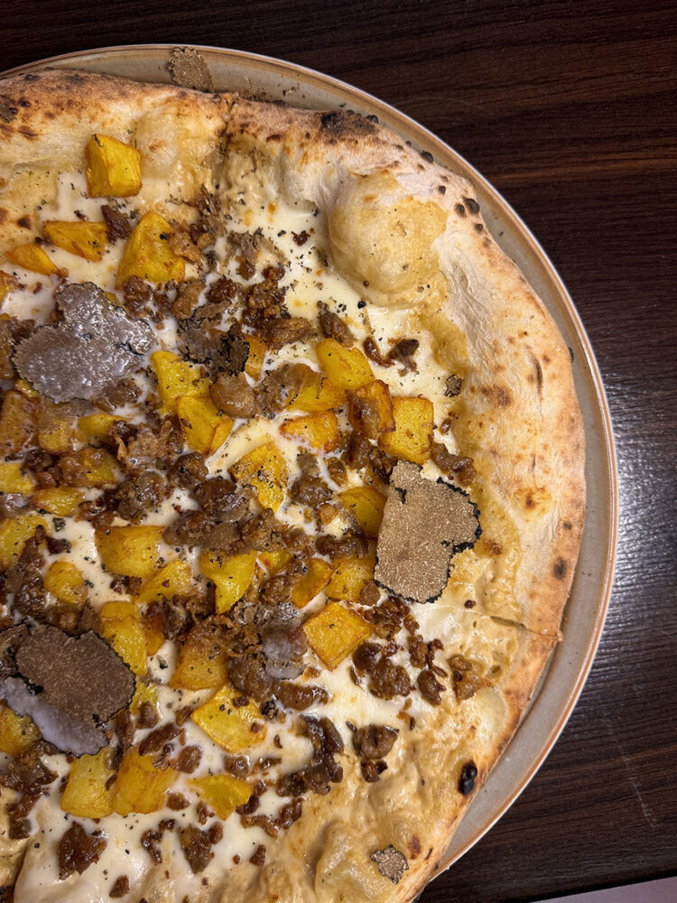 Non poteva mancare poi la Margherita Autentica, pizza storica de L’A’mmasciata, realizzata con Pomodoro San Marzano dell’Agro Sarnese-Nocerino DOP, mozzarella di bufala casertana DOP, basilico e olio extravergine d’oliva calabrese in matrimonio perfetto con il Cirò Rosato di Vigneti Vumbaca e poi a gran richiesta ritorna la Bosco Calabrese, con crema di funghi porcini, Fiordilatte STG, salsiccia di maialino nero Fagnanese, patate silane in doppia cottura, colatura di caciocavallo podolico, tartufo nero del pollino e olio extravergine d’oliva in pairing con l’Aglianico riserva D’Erasmo sempre di Cantina Nifo Serrapochiello.