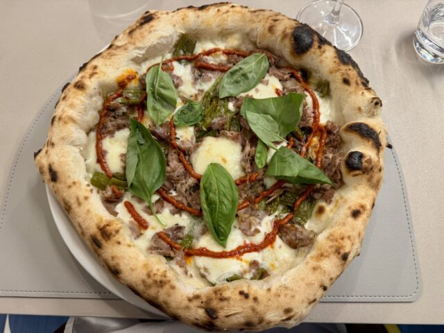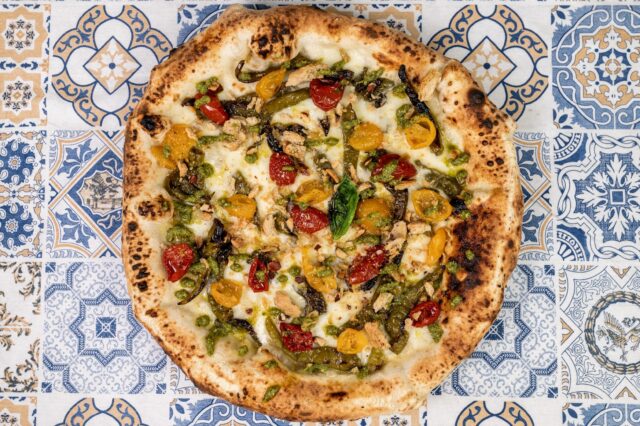Pizza “Sapore Antico” (chef Gianluca Rotondo): farina Senatore Cappelli, fior di latte, friggitelli saltati, pomodorini pachino al forno, scaglie di cacio ricotta del Gargano, olio EVO e basilico.