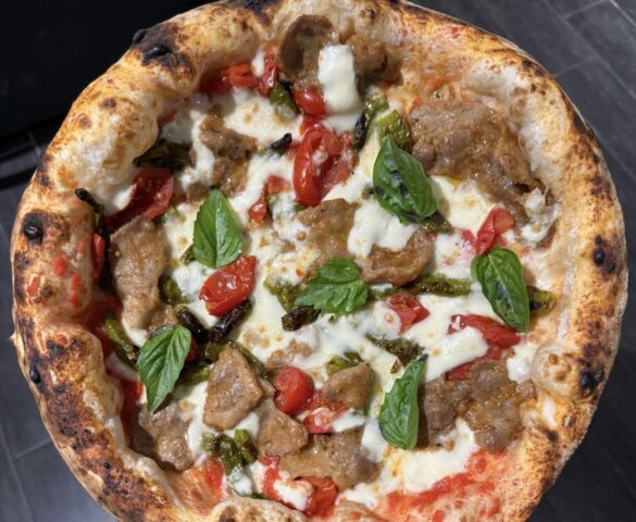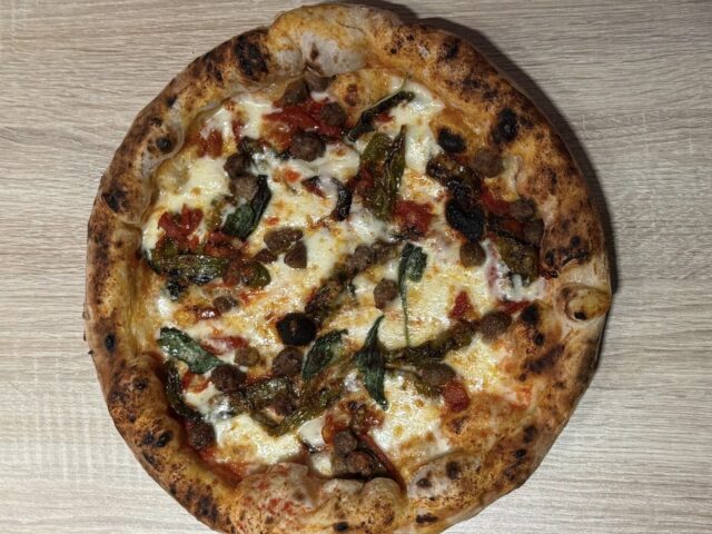 Pizza “Camouflage”: fior di latte, salsiccia di maialino nero, friggitelli, datterino rosso, cacio ricotta, basilico, olio EVO.
