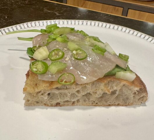 Piattino “Pane e Ceviche”: padellino con base biga, madre, gel di segale e orzo; misticanza, ceviche di ricciola di Ischia, sedano croccante e peperoncino verde.