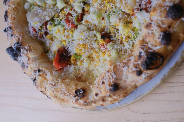 Pizza “Cornetto”: fior di latte DOP pugliese, pomodori scattarisciati, cornetto verde dal loro orto, crumble di pane alla curcuma, cacio ricotta leccese, olio “Guglielmi”, basilico.