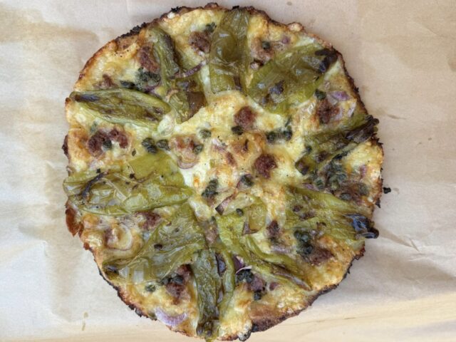 Focaccia-style “Friggitello-style n.4”: base bianca, mozzarella, friggitelli marinati a crudo, cipolla rossa marinata fredda con olio, sale, pepe, rosmarino, capperi e salsiccia di cavallo.