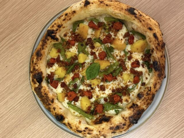Pizza “Volturno”: fior di latte, peperoncini del fiume, patata cotta sotto cenere; all’uscita pane croccante al pomodoro secco, ’nduja calabra, basilico e olio EVO.