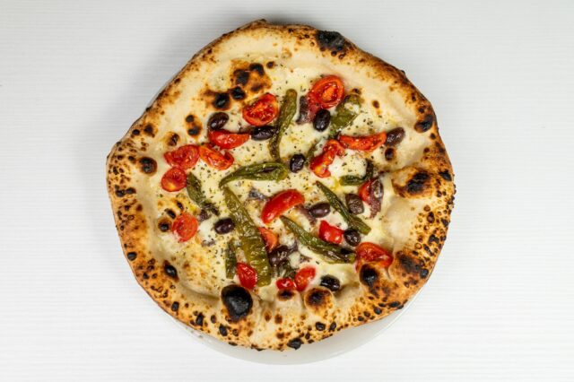 Pizza “Mediterranea”: fior di latte di Agerola, filetto di pomodoro, friggitelli saltati, acciughe, olive nere, origano e olio EVO.