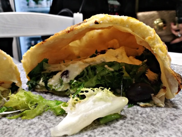 Francesco Cammarota prepara La Riccia: base formaggio e olio, poi scarola del contadino a crudo, olive taggiasche, piennolo semi dray, acciughe di Cetara, bocconcini di bufala campana e olio extravergine biologico. € 9,00