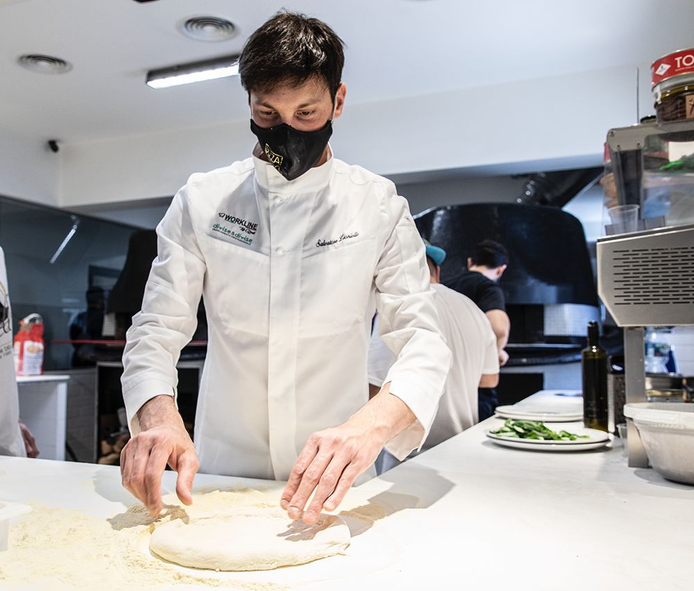 Salvatore ha dunque trasformato, per il suo disco di pasta lievitata, gli ingredienti base dell’ iconico piatto regionale in un mix di forme, colori e sapori.