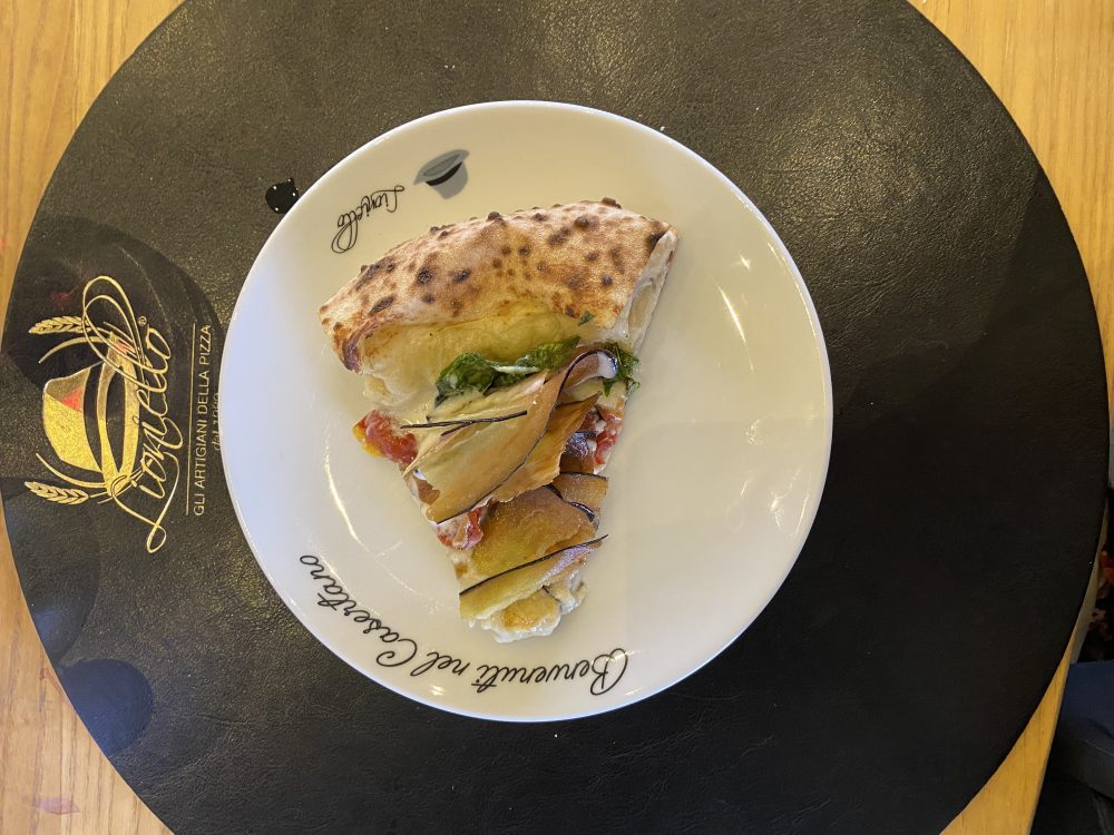 Oltre che buona, è anche bella. Salvatore Lioniello la prepara da due anni (in realtà comparve nel menù già 5 anni fa) ed è frutto di un’idea e di una messa in opera della pizza con le melanzane, prendendo spunto dalla classica e tipica parmigiana, che in Campania vede diverse scuole di pensiero sulla preparazione, e che Salvatore conosce bene.