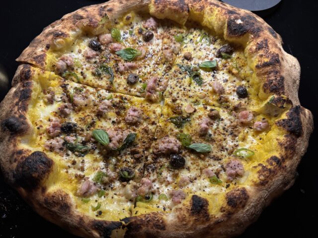 Tra le pizze stagionali, la “Puparuol ‘mbuttunat 3.0”, che ho trovato equilibrata e saporita: provola affumicata di bufala, crema di peperone giallo, polvere di peperone rosso, julienne di peperone verde all’insalata, salsiccia di maialino casertano, capperi di Salina, olive nere caiazzane, crumble di tarallo, Parmigiano Reggiano DOP, basilico fresco e olio EVO delle Colline Salernitane (13 €).