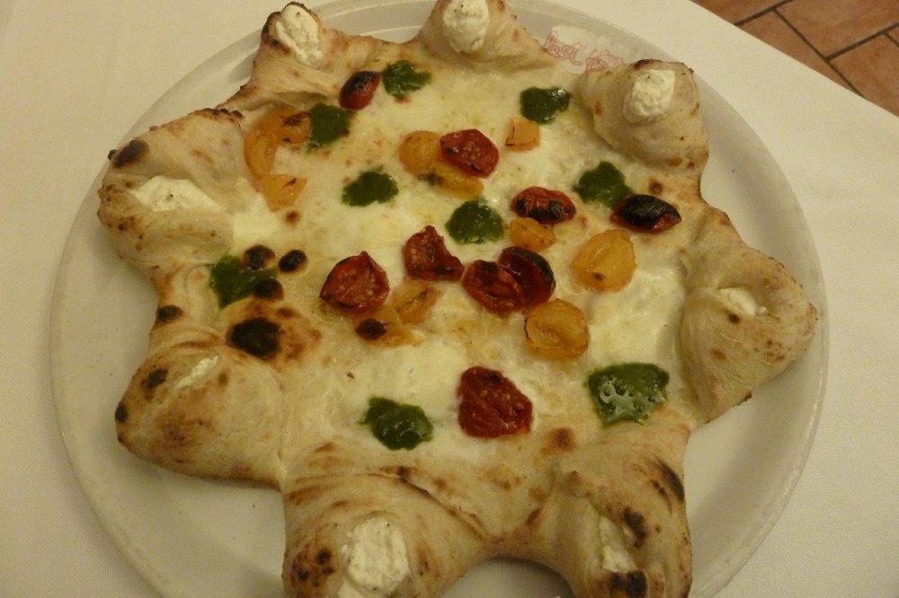 Corrado Scaglione, primo nel 2011 al Campionato del Mondo nella categoria Pizza Napoletana STG, un passato in cucina, anche in quella dell’Enoteca Pinchiorri, l’ho scoperto col tempo, prima ho lasciato fossero le sue pizze a parlare poi, realizzando che è persona che sa anche ascoltare, ho cominciato ad alternare morsi di pizza a parole in libertà, ed è stato un piacere, quasi quanto quello procurato dalla mia prima Stella di Bachetti, provata da lui, con bufala DOP con pomodorini gialli e rossi confit, clorofilla al basilico, grana, ricotta nelle punte, basilico, olio EVO, la pizza è un tributo alla Pizza Carnevale a forma di sole di Attilio Bachetti, storico locale alla Pignasecca che sforna dal 1938…