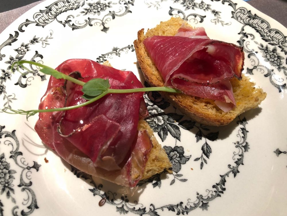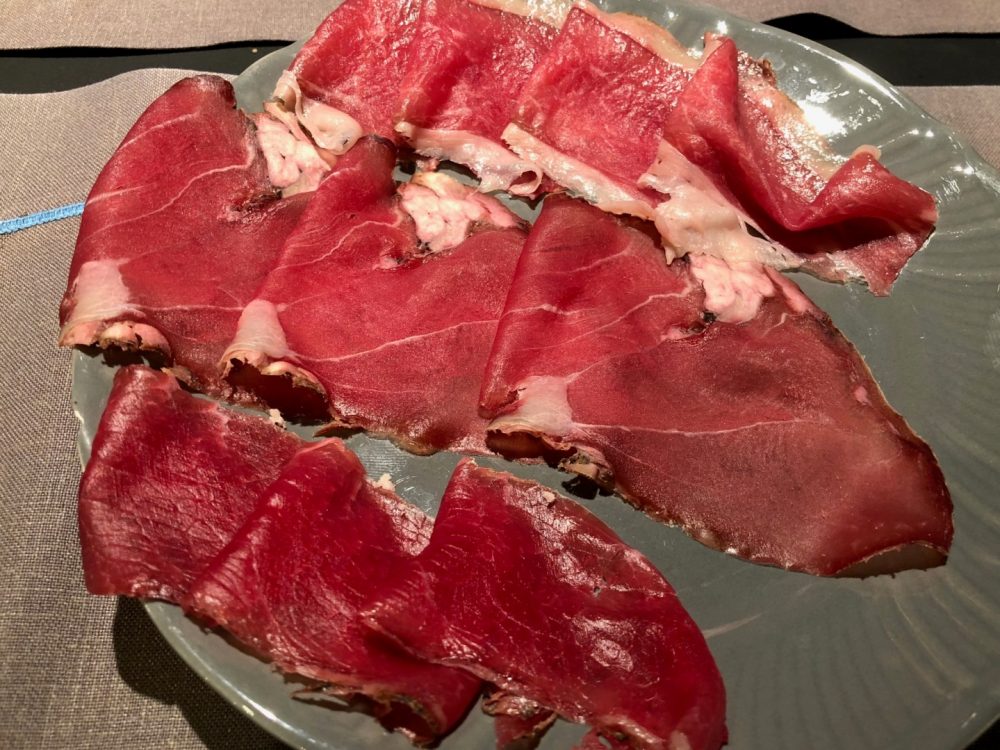 Tre diversi assaggi di bresaola che sembra prosciutto crudo, tre muscoli diversi di bue di razza piemontese massaggiati a mano e conditi con sale, pepe, bacche di ginepro, alloro senza additivi aggiunti, una di quelle cose che capita molto raramente di incontrare sulla strada di appassionato errante…