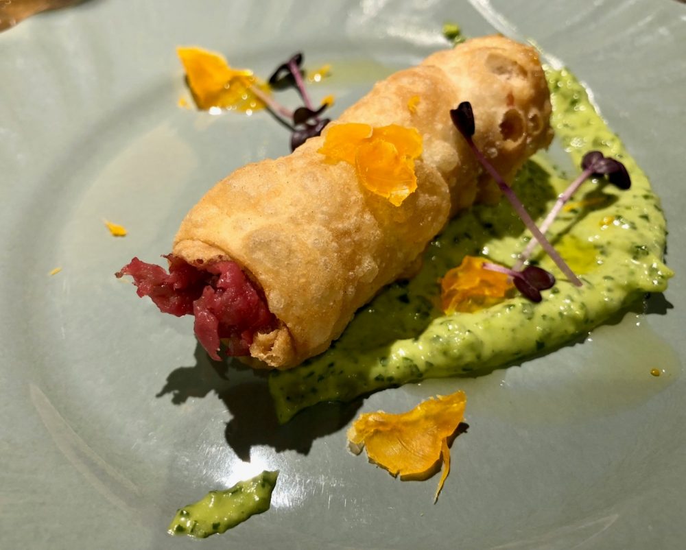 Cannolo di pizza farcito con tartare di fassona piemontese, salsa verde e tuorlo marinato