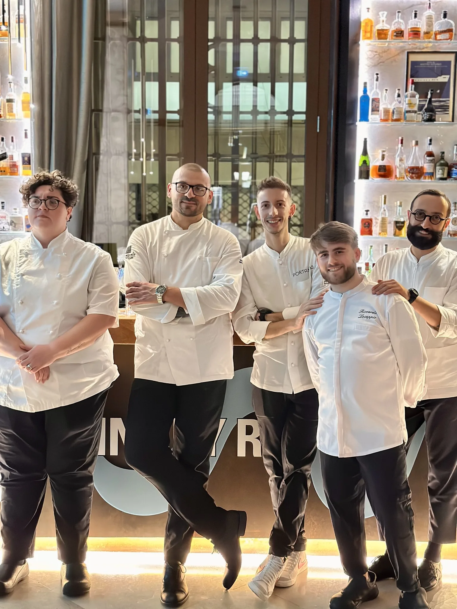 Angelo Sabatelli con Danilo Giaffrida, Albert Sapere. Alle spalle Simone de Siato chef resident con gli allievi di Angelo