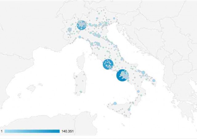 Qui vedete le letture sparse in Italia secondo il programma Google Analytics. Si evidenzia che siamo molto seguiti in tutte le regioni, brillano oltre le tre grandi città tutta la dorsale adriatica dalla Puglia sino al Veneto, e il Piemonte.