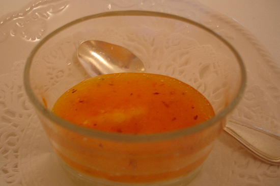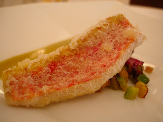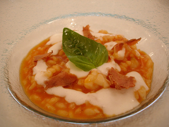 Decisamente lontano dai miei gusti questo riso "in rosso" con aragostina, burrata e bottarga, o come definita : parmigiana liquida. Il risultato finale è proprio molto catalano, sucrè-salè. Mi torna in mente la Ruscalleda..