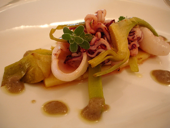 Tenerissimi calamaretti ( o totanetti? ) in insalata tiepida di carciofi, salsa bagna cauda , panissetta di ceci e profumo di maggiorana, Olè!