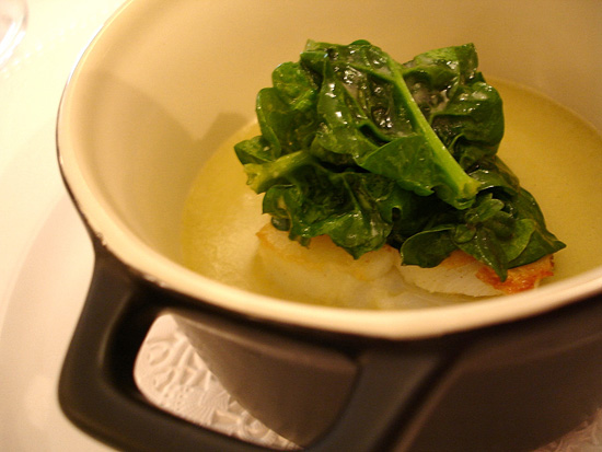 Più nordico il coccio di crema di patate e porri , baccalà al burro di malga e spinaci saltati a crudo.