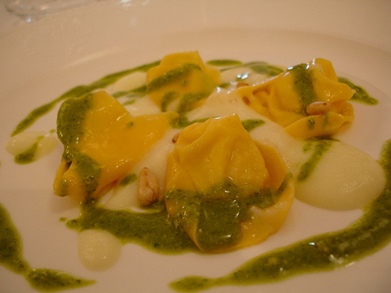 Si sovrappone sul precedente baccalà questa pasta fresca farcita del medesimo pesce ( qui mantecato in brandacujun), ma rinvigorito da convincente pesto, soffice spuma di patate e pinoli tostati