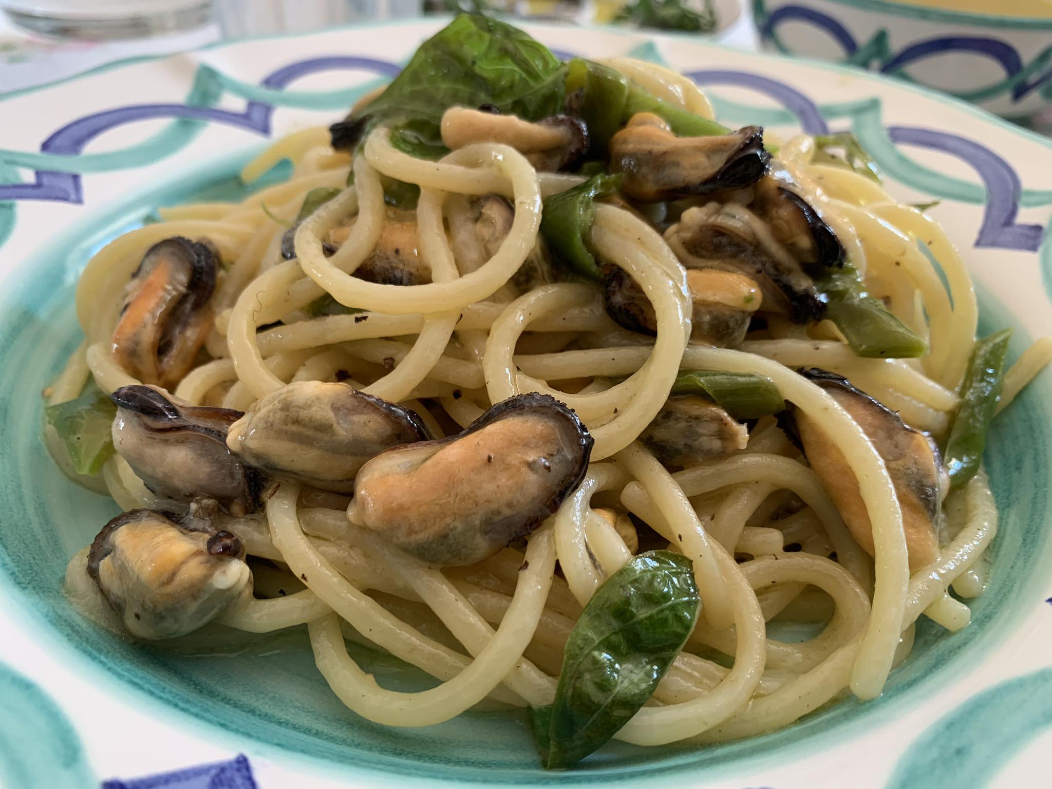 Scolare gli spaghetti molto al dente e girarli nel tegame con le cozze e i friggitelli per un minuto. Un’ombra di pepe macinato al momento, qualche foglia di basilico e servire.