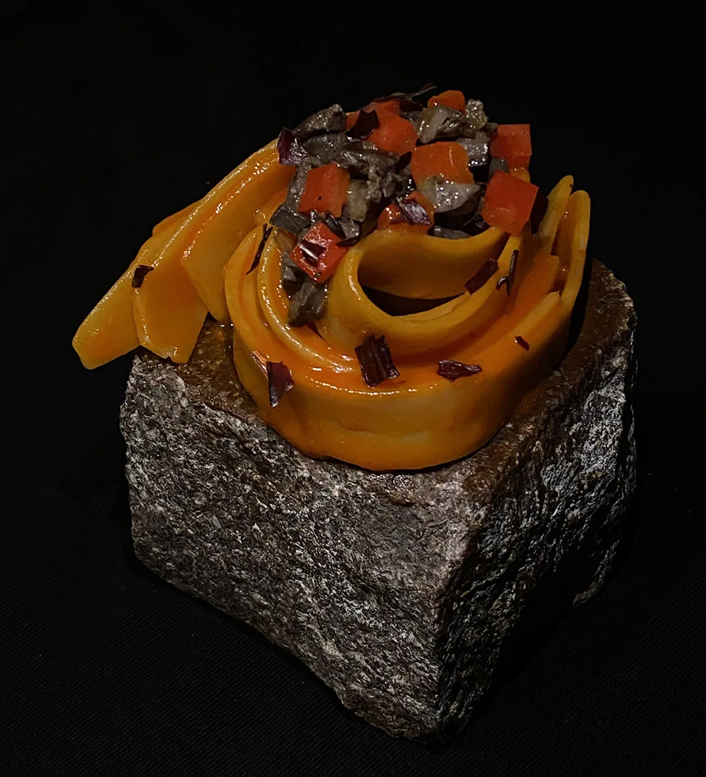 Questa ricetta vuole rappresentare un viaggio tra passato e futuro dando vita a una pietanza che abbia come immaginario comune, la convivialità. Convivialità donata da una preparazione tipica della tradizione romana, “Pollo e Peperoni”, piatto che da generazioni accomuna e riunisce famiglie romane e non solo a tavola. La pietanza, che da un po’ di anni sta scomparendo dall’immaginario culinario viene reinterpretata come un primo piatto di pasta, simbolo celebre di ciò che più ci rappresenta a livello globale per storia e tradizione.