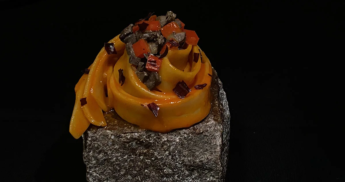 Questa ricetta vuole rappresentare un viaggio tra passato e futuro dando vita a una pietanza che abbia come immaginario comune, la convivialità. Convivialità donata da una preparazione tipica della tradizione romana, “Pollo e Peperoni”, piatto che da generazioni accomuna e riunisce famiglie romane e non solo a tavola. La pietanza, che da un po’ di anni sta scomparendo dall’immaginario culinario viene reinterpretata come un primo piatto di pasta, simbolo celebre di ciò che più ci rappresenta a livello globale per storia e tradizione.