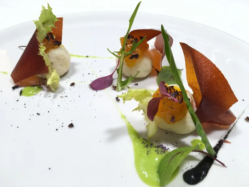 Porre infine nel piatto l’emulsione di scarola riccia, le sfere di baccalà mantecato, la confettura e le chips di pomodoro alternate a ciuffetti di scarolina a crudo.