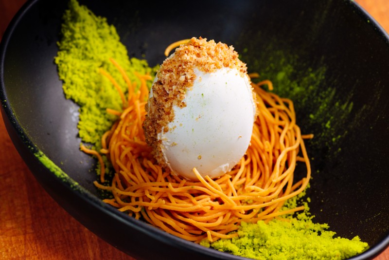 Adagiare gli spaghetti sul fondo di un piatto (possibilmente di colore nero), posarvi sopra “l’uovo” e spolverare il piatto con la madeleine al basilico ridotta in briciole.