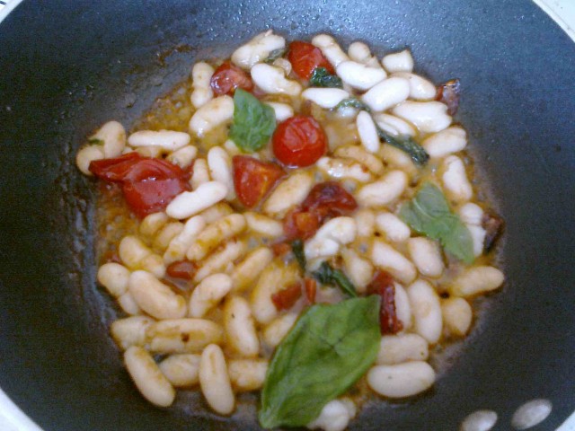 Questa è una versione estiva, quindi molto fresca e poco impegnativa, di pasta e fagioli con i cannellini di Acerra. Fate rosolare lo spicchio di aglio nell’olio, insieme a quattro pomodorini tagliuzzati e due o tre listarelle di peperoncino verde, per dare al piatto un po’ di freschezza e acidità. Aggiungete dopo qualche minuto metà della scatola di cannellini e poi passate tutti gli ingredienti (tranne lo spicchio di aglio) al minipimer. Versate nel tegame con la crema l’altra metà di cannellini interi. Fate cuocere molto al dente i tubetti prima in acqua e poi qualche minuto nel tegame con i fagioli. Un minuto prima di spegnere il fuoco aggiungete abbondante basilico fresco e lasciate riposare un po’ prima di servire.