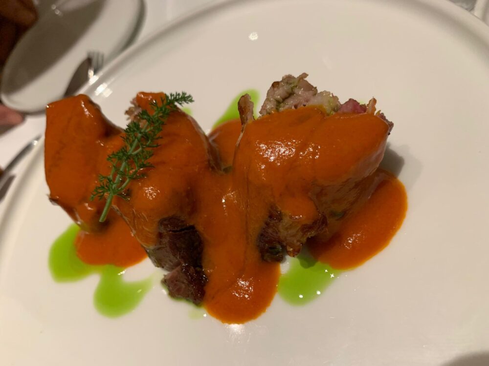 Si tratta di un primo piatto a doppio servizio molto semplice: un ragù di involtino di manzo servito a parte sopra i rigatoni (in questo caso piccoli rigatoni, rigantonecelli oppure i mezzanelli)) che il cliente può scegliere di mangiare con o senza la carne. Lo travate da Trattoria Stecca a Roma la nuova osteria nata da due miti, Flavio Veloavevodetto e Mammarossa ad Avezzano. Come si diceva un tempo, vale il viaggio.