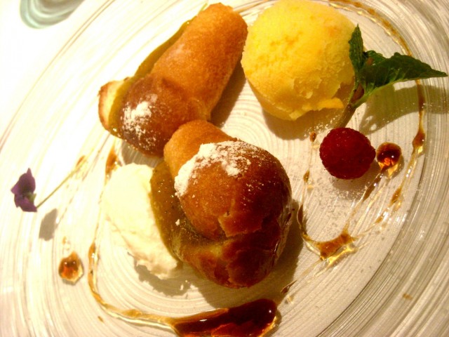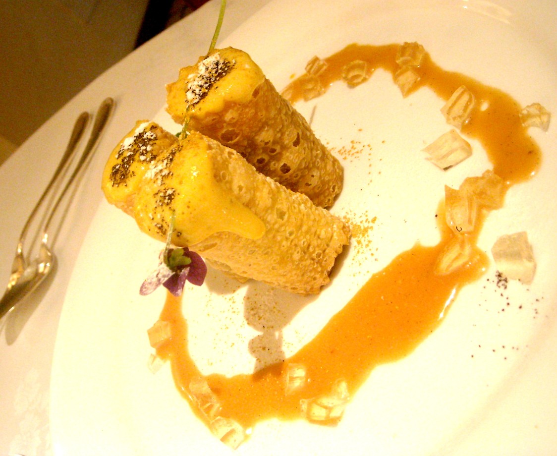 Cannolo croccante, cioccolato, vaniglia e tabacco con gelée al single malt (L'Arco Antico di Savona, chef Flavio Costa)