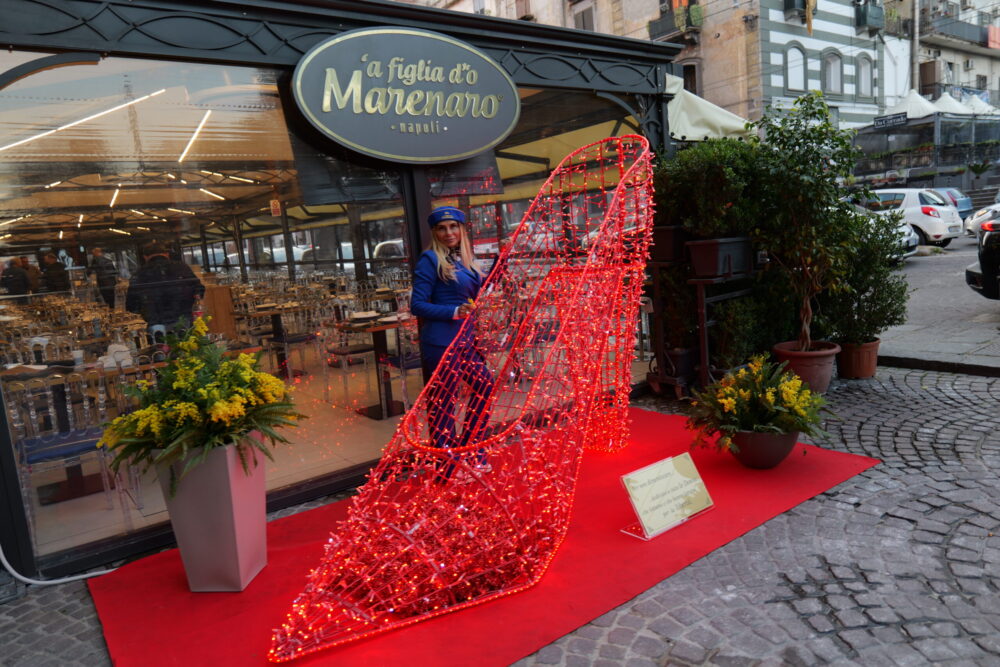 Davanti al ristorante ‘A Figlia d’o Marenaro, in via Foria 182, è stata collocata una installazione simbolica di oltre 2 metri: una enorme scarpa rossa, a richiamare le “scarpette rosse” ideate nel 2009 dall’artista messicana Elina Chauvet per denunciare gli abusi sulle donne e il femminicidio, con l’intenzione da parte dell’imprenditrice partenopea di ricordare – in questa giornata dell’8 marzo – tutte le donne che hanno lottato e coloro che lottano ancora. Per sottolineare la lotta per i diritti delle donne, la lotta contro la violenza (basta pensare ai femminicidi dell’ultimo anno), la lotta per la libertà. Accanto all’installazione, una targa con su scritto: “Per non dimenticare… dedicato a tutte le Donne che lottano e che hanno lottato per la libertà“.