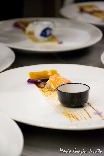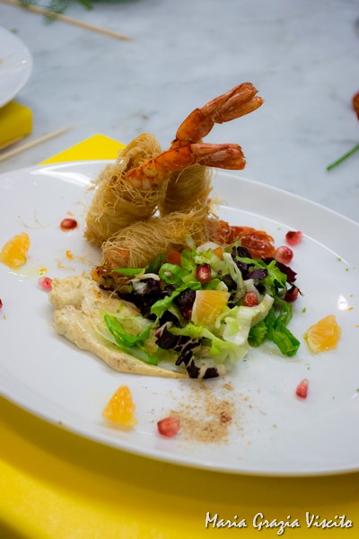 Finalmente si arriva al laboratorio, dove ad attenderci c’è un piano di cottura e un piano di lavoro che è il sogno, neanche tanto segreto, di ogni blogger. Fantastico, non c’è che dire. Gli chef ci mostrano le preparazione di tre diverse piatti, dai gamberi bardati in pasta Kataifi, al polpo in olio cottura al risotto zucca, gorgonzola e liquirizia. Noi ci mettiamo lì, ascoltiamo, facciamo domande, eseguiamo, attendiamo con ansia il passaggio dei vari chef che assaggiano. E quando fanno un segno di assenso è soddisfazione pura. Ah, tentiamo di comporre sempre il piatto ispirandoci alla ristorazione, che anche l’occhio vuole la sua parte.