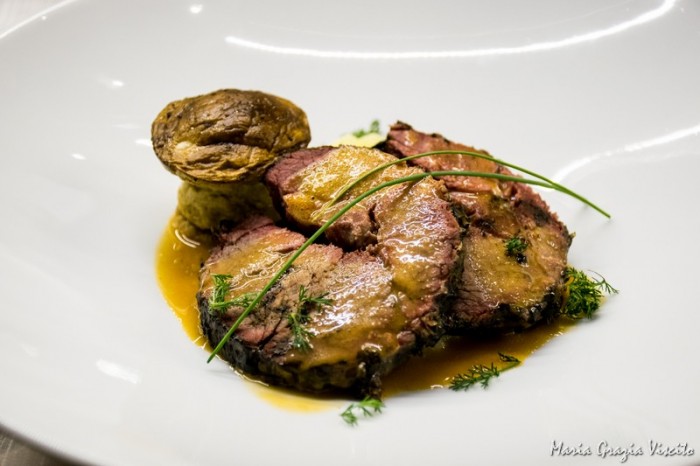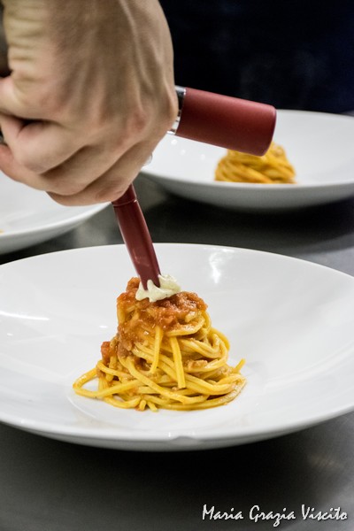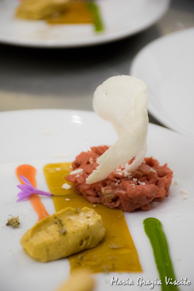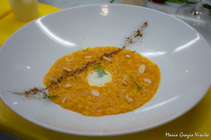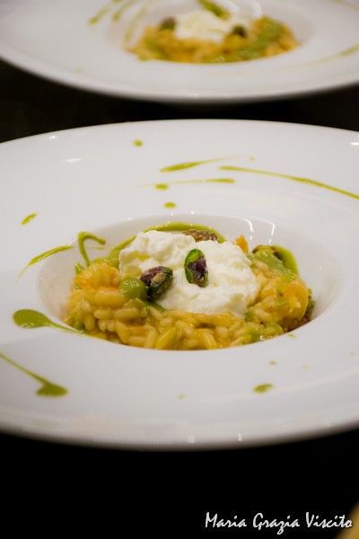 Banco apparecchiato e fornelli vicini, gli chef (Francesco Triscornia, Simone De Siato, Giuseppe Settanni) ci cucinano più piatti: dall’antipasto di stampo orientale, alla carne cotta a 40 gradi, al risotto pistacchi, bisque di gamberi e burrata, alla matriciana con carbonara, dalla punta di petto a bassa temperatura, al dessert al piatto a base di frutta.