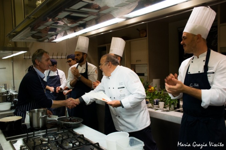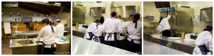 Visita all’Orto dei semplici, nome degno dell’antico convento che ospita il Campus Etoile . Orto fiore all’occhiello della scuola, dove vengono coltivate una serie infinite di erbe aromatiche: menta, rosmarino, verbena, basilico, organo, verbena, melissa, timo, etc etc ma anche peperoni, melanzane, carciofi e simili: tutte cose che ogni mattina gli studenti vanno a raccogliere e che usano nel corso. Siamo invitati a sceglierne diverse a piacimento da usare durante la preparazione dei nostri piatti (e il panico, un po’, sale). Prima di andare via, una domanda agli chef: quale sono le cose più importanti che insegnate? E la risposta è lapidaria: pulizia, disciplina e materie prime.