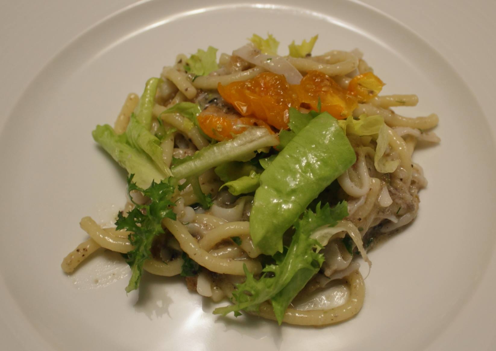 Luigi Nastro, chef residente, invece, si è esibito con gli spaghettoni con tocchetti di alici, pomodorino candito, mollica di semulella croccante, insalatina riccia all’olio e aglio, julienne di calamari veraci.