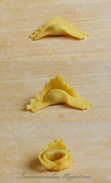 Sollevare la punta del triangolino e richiudere il tortellino sulla punta dell’indice, o del mignolo, premendo decisamente per assottigliare la pasta, che nel punto di sovrapposizione rischierebbe di rimanere troppo spessa.