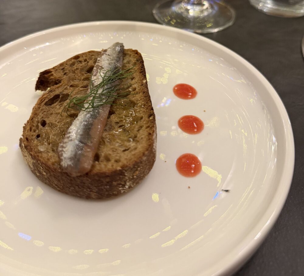 Il prologo è stato un elogio alla semplicità: bruschetta (realizzata con farina Perciasacchi, di segale e semi di lino) con alice del Mar Mediterraneo, marinata in olio aromatizzato al limone, e finocchietto. Chiamata “L’alba sullo Stretto”, tanto essenziale quanto decisa, ha avuto il pregio di valorizzare la materia prima nella sua purezza.