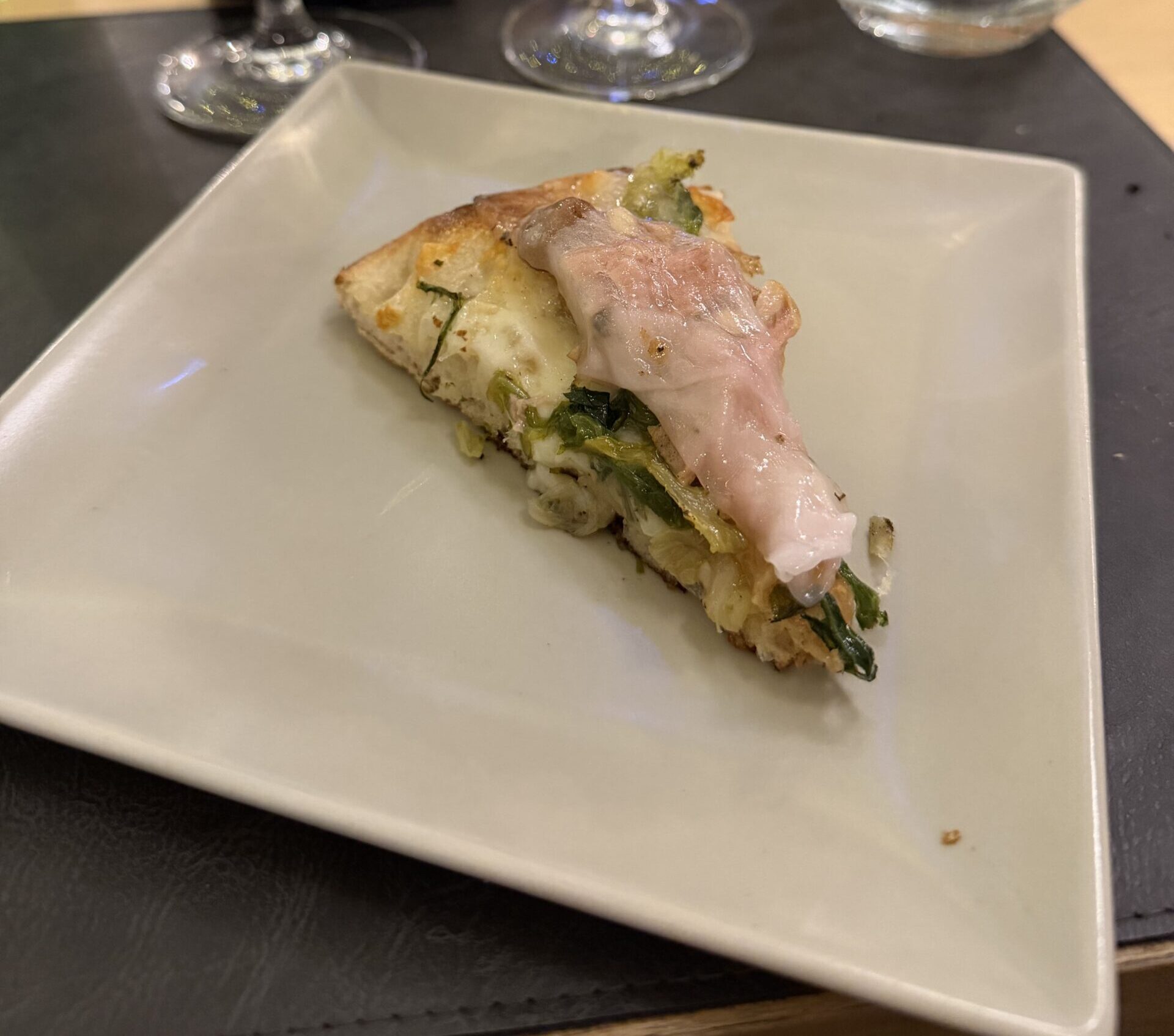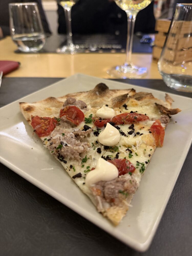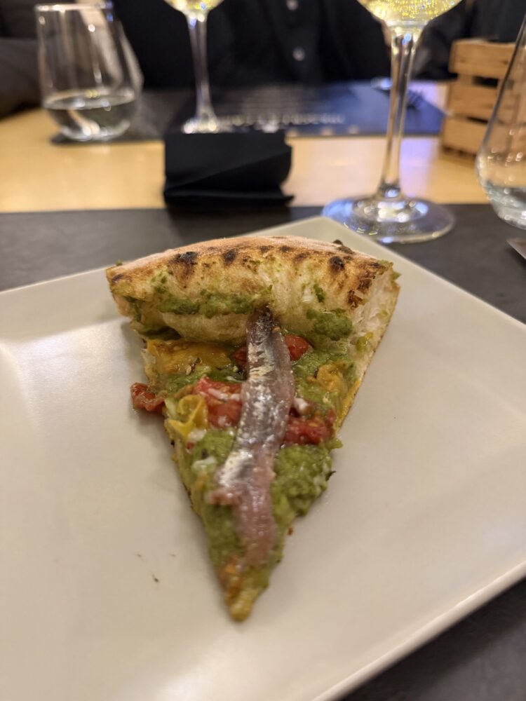 La prima proposta è stata fondata su un impasto con una significativa percentuale di grano duro, che richiamava la tradizione della pizza siciliana: croccante, dal bordo sottile. L’elemento distintivo è stato